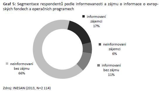 Největší skupinu obyvatel ČR tvoří neinformovaní bez zájmu, kterých jsou dvě třetiny (66 %), zatímco informovaných bez zájmu je celkem 11 %. Více než tři čtvrtiny respondentů se tedy o problematiku evropských fondů a operačních programů nezajímají. Ostatní dotázaní (23 %) se o problematiku zajímají, přičemž významná většina těchto respondentů hodnotí svou informovanost v této oblasti jako dostatečnou.
