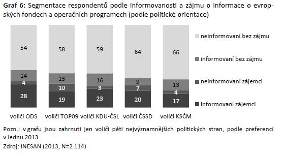 Zajímavý je pohled na jednotlivé segmenty z hlediska politické orientace respondentů. V segmentu informovaných zájemců dominují voliči ODS, kterých je celkem 28 %, naopak nejmenší zastoupení mají v tomto segmentu voliči KSČM (těch je 17 %). Voliči KSČM spolu s voliči ČSSD dominují se 66 % resp. 64 % v segmentu neinformovaných bez zájmu.