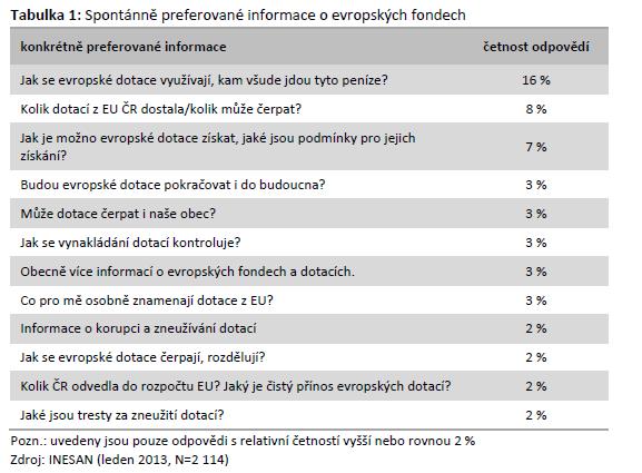 V případě komunikace regionální politiky lze za sdělení považovat například informace o existenci strukturálních fondů a operačních programů, informace o zaměření jednotlivých operačních programů, informace o podmínkách získání prostředků z fondů EU, informace o příjemcích podpory, informace o úspěšně realizovaných projektech, informace o dopadech a přínosech evropských dotací apod. Jak však tato sdělení korespondují s tím, jaké informace o regionální politice a evropských fondech preferují obyvatelé České republiky? O co se v této souvislosti obyvatelé ČR nejvíce zajímají? Data o preferovaných informacích týkajících se této oblasti poskytuje výzkum, který provedl Institut evaluací a sociálních analýz (INESAN) v roce 2013. Z výsledků vyplývá, že o informace o regionální politice EU se zajímá téměř 60 % obyvatel. Z konkrétních informací se nejčastěji zajímají o využití dotací z evropských fondů, o charakter projektů, které se jimi financují, o celkovou výši alokace pro Českou republiku na období 2007–2013, o možné způsoby čerpání evropských dotací a o podmínky jejich získání. Podrobnější přehled nejčastěji uváděných odpovědí je zachycen v následující tabulce: