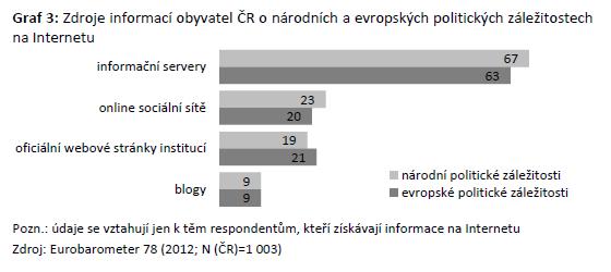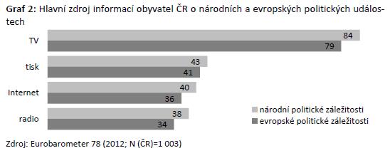 Jaké informační nástroje využívají k získávání informací o evropských politických tématech a záležitostech obyvatelé ČR? Odpovědi na tuto otázku poskytuje například výzkum Eurobarometer 78 realizovaný na podzim 2012. Ze spontánních odpovědí vztahujících se k respondentům z ČR vyplývá, že jako hlavní zdroj informací o národních i evropských politických tématech a záležitostech využívají obyvatelé ČR především televizi (přibližně čtyři pětiny). Tisk slouží jako hlavní zdroj informací dvěma pětinám obyvatel, Internet a rádio považuje v této souvislosti za hlavní zdroj informací více než třetina obyvatel ČR.