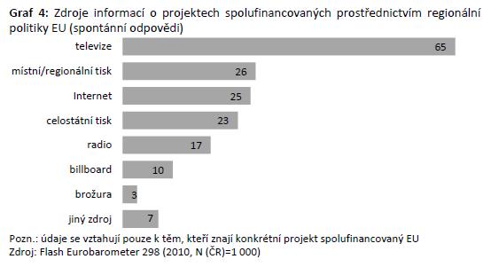 Důležitost mediální komunikace dokládá také výzkum Flash Eurobarometer 298 z roku 2010, který se zabýval otázkami spojenými přímo s regionální politikou EU. Z jeho výsledků v této souvislosti vyplývá, že o projektech spolufinancovaných z prostředků EU se obyvatelé ČR dozvídají jednoznačně nejčastěji prostřednictvím televize (dvě třetiny z nich). Prostřednictvím regionálního a celostátního tisku a prostřednictvím Internetu se o projektech financovaných z EU dozvídá přibližně čtvrtina obyvatel ČR. Ostatní dotazované zdroje informací, jako jsou rádio, billboardy, informační brožury a další využívá jako zdroj informací o projektech spolufinancovaných z evropských fondů méně než pětina obyvatel.