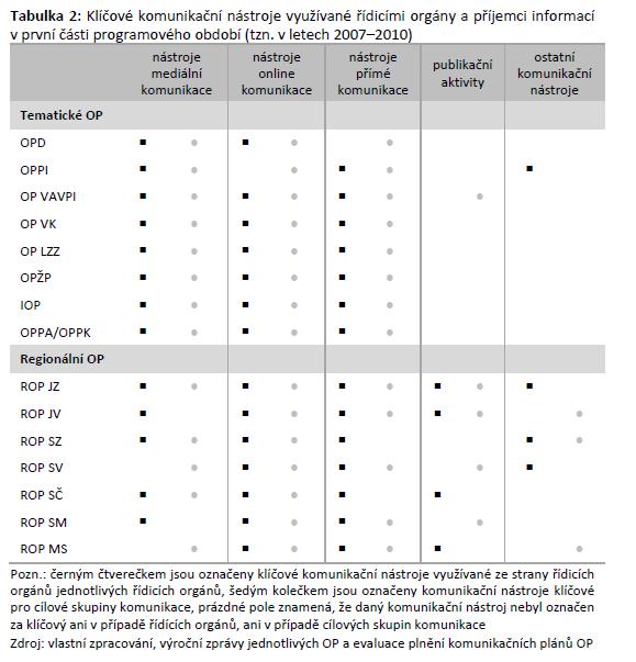 Vhodné nastavení komunikačního mixu potvrzují také zjištění a závěry provedených interim evaluací plnění komunikačních plánů jednotlivých operačních programů. Vyplývá z nich, že mezi klíčové komunikační nástroje, jak ze strany zdrojů komunikace (řídicích orgánů OP), tak ze strany příjemců sdělení (cílových skupin), patří nástroje online, mediální a přímé komunikace. V následující tabulce jsou černým čtverečkem označeny komunikační nástroje, na kterých je komunikace daného operačního programu založena (ostatní nástroje jsou použity spíše jen doplňkově). Šedou tečkou jsou označeny komunikační nástroje využívané veřejností.