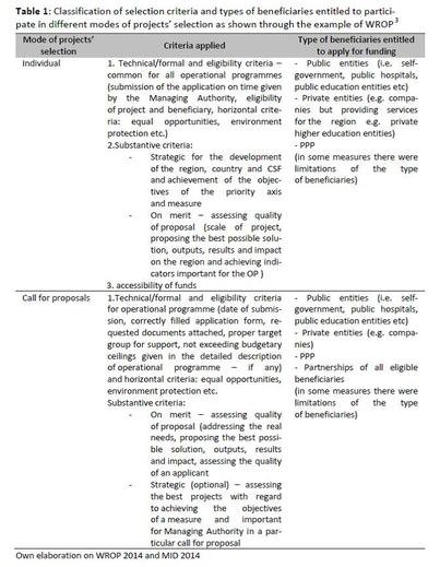 Managing authorities at both national and regional levels are responsible for choosing the best projects to be destined for support from European funds that can contribute as much as possible to achieving the objectives of operational programmes (OP). In Poland in 2007–2013 all operational programmes were divided into priority axes, measures and even sub-measures in certain cases. Selection of the projects was conducted at the level of measures/sub-measures with specific assessment criteria and conditions set up for each measure. The practice shows that the institutions participating in the implementation of operational programmes have used existing statutory solutions in a very flexible and creative way. The same projects are in some cases classified as systemic projects, while in other cases they are understood differently. Moreover, the selection criteria related to each of the modes are often imprecisely defined as well (our own analysis of the documentation of boards of Polish regions 2014, CRSG 2013). In consequence, most projects are able to meet the established criteria and this, in turn, makes the selection of projects even more difficult. In addition, the preliminary research indicates that the selection system based on calls for proposals generates large costs for the whole system of implementation because of excessive bureaucracy (MRD 2013, MID 2014). On the other hand, the same mode casts doubts on the quality of the experts’ work in the assessment[1] of projects. This is due to the large number of applications to be evaluated by one expert or the limited possibilities to compare other applications. It is interesting to note that the system for project selection provides for an ability to protest against the assessment of those projects which are assessed positively but which have not received funding due to a large number of applications.
