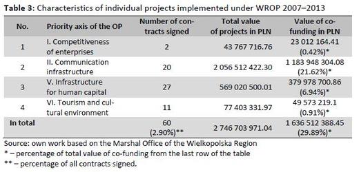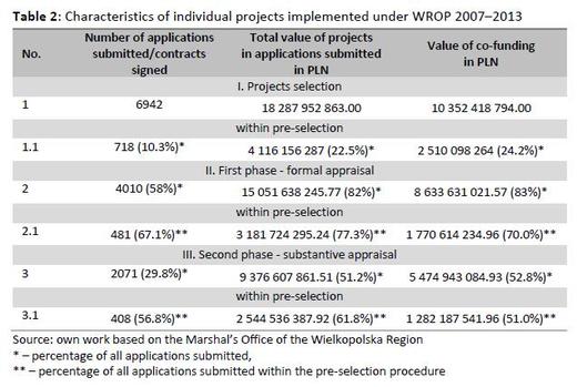 Table 2 presents the data concerning progress in the implementation of WROP as well as the results of the selections of projects. According to these data, since the start of programmes until 5th May 2014, 6942 applications were submitted to the regional Managing Authority. As a result of the formal appraisal, 4010 of them (for the global amount of co-financing of PLN 8.6 billion) fulfilled the formal criteria and were approved for the further assessment. This means that over 40% of all applications submitted were rejected at the first phase of selection, which ranks the Wielkopolska region second among all 16 Polish regions (MID 2014, p. 63). During the same period, after carrying out the substantive appraisal, 2071 contracts for co-financing were signed with beneficiaries for the amount of PLN 5.5 billion. This highlights that only less than 30% of all the applications submitted were granted financial support within the framework of the WROP.
