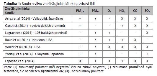 Význam kvality ovzduší a jeho znečištění na zdraví obyvatelstva je nezpochybnitelný. Řada výzkumů se věnuje problematice vztahu znečištění ovzduší a zdravím obyvatelstva. Zde uvádíme pouze stručný výčet studií z poslední doby, které se věnují stejným polutantům, jakým jsme se ve svém výzkumu věnovali my, tj. PM2.5 a PM10, ale zahrnují i například O3, SOx a NOx.