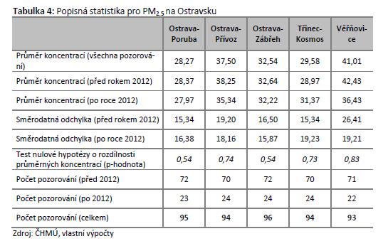 Tabulka 4 ukazuje popisnou statistiku pro PM2.5. Pro tento typ polutantu máme údaje za 5 měřících stanic na Ostravsku. Pro každou stanici uvádíme průměrné koncentrace pro celé období, průměrné koncentrace pro období před a po lednu 2012, příslušné směrodatné odchylky, p-hodnota statistického testu rovnosti průměrných koncentrací před a po lednu 2012 (p-hodnota nižší než 0,05 by indikovala zamítnutí hypotézy o rovnosti průměrných koncentrací) a počty měsíčních pozorování pro jednotlivá období.