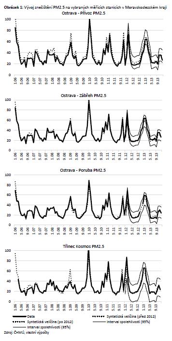 V našem případě jsme „nasyntetizovali“ časové řady koncentrací PM2.5 a PM10 na Ostravsku (syntetizovali jsme i další znečišťující látky, ale tyto dvě považujeme, s ohledem na cíle programu, za nejdůležitější). „Syntetický“ region je postaven na datech do 2012 (nebo podle toho, jaký rok vezmeme jako přelomový) včetně a kontrafaktuál (předpokládaný vývoj bez investic) je od ledna 2013 (či po přelomovém roce). Aby poskytla metoda kredibilní výsledky, je třeba, aby regrese na základě dat z jiných regionů dobře vysvětlila zkoumaný region do období 2012 (resp. ve zkoumaném období).