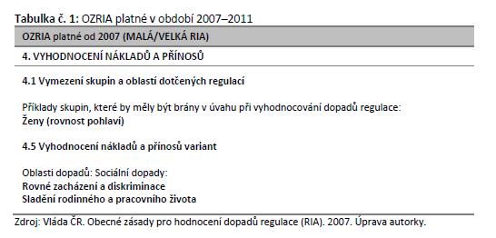 V období 2007–2011 OZRIA explicitně operují s koncepty rovnost pohlaví, sociální rovnost/spravedlnost a přímo nařizují hodnotit dopady s ohledem na ženy jako specifickou sociální skupinu hodnou zvýšené pozornosti (Obecné zásady…2007). Podobu pravidel hodnocení dopadů na rovnost mužů a žen v tomto období lze nahlédnout v tabulce č. 1.