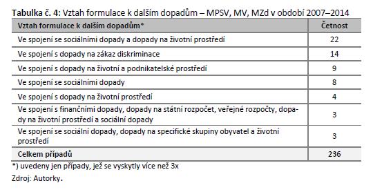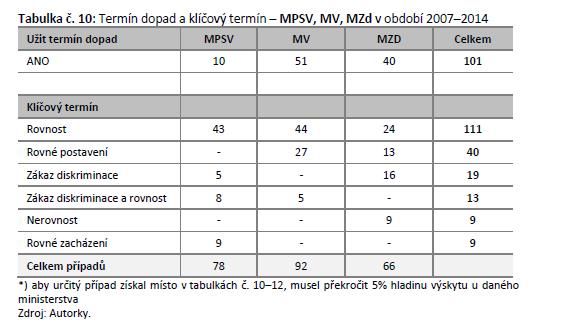 Jak ukazuje tabulka č. 10, hodnocení, která v souladu s pravidly užívají termín dopad, pocházejí v nadpoloviční většině případů od MV a ve 40 případech od MZd (srov. MPSV). Nadto, MV (ovšem i MPSV) velice často kombinuje právě výraz dopad s doporučovaným klíčovým termínem rovnost. V případě MPSV je však nutno zmínit, že pokud je již výraz dopad skutečně užit, je to celkem u pěti případů v souladu s výše jmenovanou stupnicí a konkrétně s atributem pozitivní (srov. dva případy užití stupnice u MV a MZd).