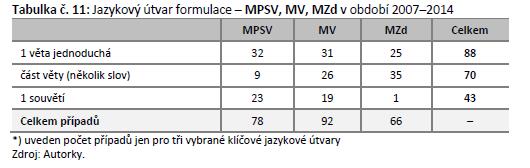 Výstupem z tabulky č. 11, na nějž by měl být kladen důraz, je zejména průměrný počet slov, který nabývá jednoznačně nejvyšší hodnoty u MPSV. Naopak ministerstvem, které v tomto výstupu, potažmo i dalších uvedených zaostává, je MZd. Tyto informace jsou dále rozvíjeny v grafu č. 1, který sleduje vývoj průměrného počtu slov hodnotících formulací, a to u všech ministerstev v letech 2007–2014.