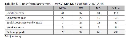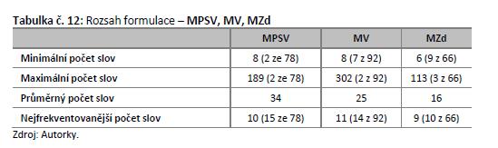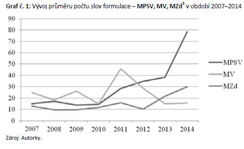Jak již bylo zmíněno výše, lze odhadovat, že ministerstvem, které věnuje formulaci nejméně prostoru je MZd. Napříč všemi ministerstvy a lety se průměr slov nejčastěji pohybuje v intervalu od deseti do 20 slov. Výraznější růst nastává jen v letech koncových. Pohyby křivek MPSV a MZd už se, co do hodnot průměru, víceméně shodují, povětšinou nepřekračují 30 průměrných slov na jednu formulaci. Jak v případě MPSV, tak MZd lze v období 2007–2011 zaznamenat převážně plynulý a pozvolný růst. Kontrastem je křivka MV, která zažívá jak prudké nárůsty, tak pády.