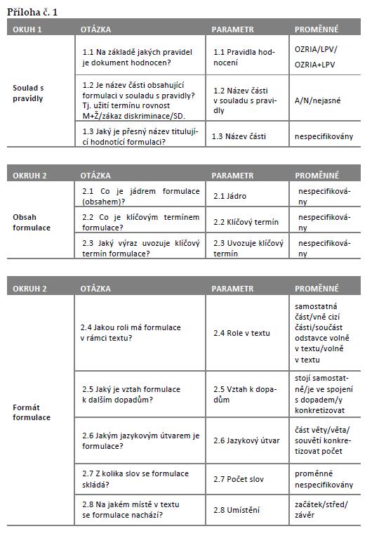 Metodický rámec hodnocení dopadů regulace na rovnost v ČR byl v období provádění analýzy determinován třemi klíčovými dokumenty. Těmi jsou Obecné zásady pro hodnocení dopadů regulace (OZRIA), Legislativní pravidla vlády (Legislativní pravidla) a Jednací řád vlády (Jednací řád). Jmenované dokumenty procházejí od roku 2007 ne sporadickými, a též do jisté míry problematickými, novelizacemi, jež výrazně upravují právě oblast hodnocení dopadů na rovnost. Na začátku roku 2015 (tj. po provedení naší analýzy) byl tento rámec rozšířen o již zmíněnou Metodiku, která dává návod, jak hodnotit dopady ne/legislativních materiálů, a to specificky pouze na rovnost mužů a žen. To vše s cílem zpřehlednit, zkvalitnit, ale i sjednotit proces hodnocení (Úřad vlády ČR 2014).