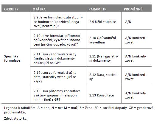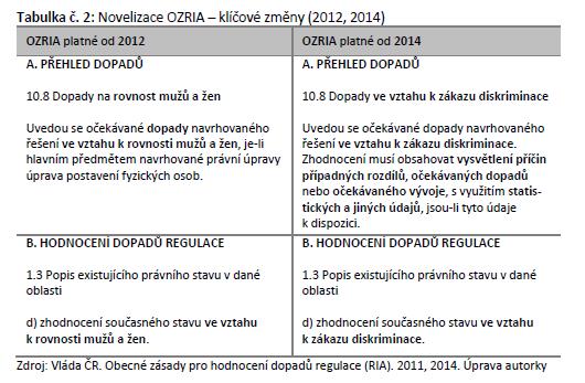 Novela OZRIA platná od roku 2012 již jasně diktuje hodnotit dopady na rovnost mužů a žen, následná novela (únor 2014) však tuto snahu výrazně brzdí (Obecné zásady…2011, 2014). Konkrétní podobu hodnocení a zmíněné změny lze nahlédnout v tabulce č. 2.