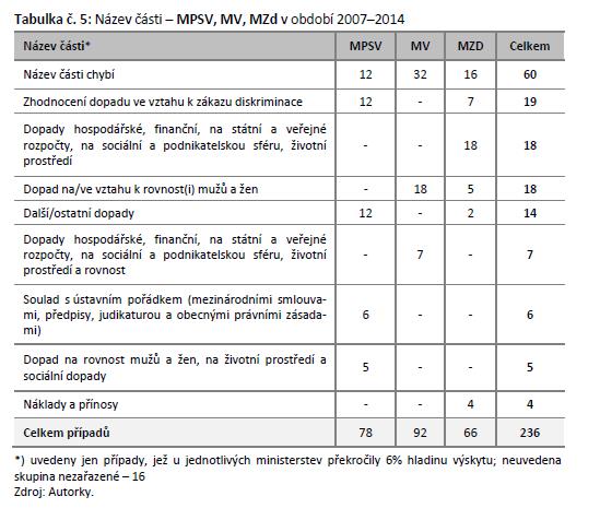 V návaznosti na předchozí je třeba upozornit, že nesoulad s metodickým rámcem se často týká i názvu části, do které je zařazena hodnotící formulace. Z výsledků vyplývá, že napříč všemi ministerstvy je v 58 % případů formulace zařazena do části, jejíž název zcela neužívá termínů rovnost mužů a žen/zákaz diskriminace, sociální dopady. To může odkazovat na již zmíněnou praxi spojování hodnocení více dopadů a v důsledku znamenat zneviditelňování vybrané agendy. Za klíčový vzorec české praxi opakující se u všech ministerstev lze označit netitulování části pojímající formulaci žádným názvem. Ministerstvem, které tento přístup nejčastěji uplatňuje, a to více jak u poloviny návrhů, je MZd. Naopak MV se tohoto vystříhává, a nadto dle vzoru metodického rámce často umisťuje (18 případů) pod název dopad na/ve vztahu k rovnost(i) mužů a žen. Opětovně všechna ministerstva velice často zařazují hodnocení více druhů dopadů pod jeden společný název (souvisí se spojováním dopadů i v samotných hodnotících formulacích – viz tab. č. 4).
