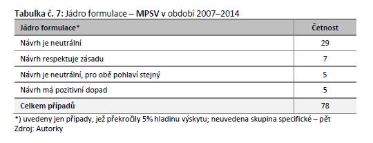 Za problematické z hlediska souladu s pravidly lze u formulace dominující u MPSV – návrh je neutrální (34 ze 78) – označit absenci ústředního termínu dopad. Formulace popisuje pouze to, jaký návrh je na oblast rovnosti/diskriminace, a opomíjí tak hodnocení toho, jaký je konkrétní dopad. Distancuje se od vymezeného cíle, a nadto se dostává do rozporu s metodickými nástroji. Zároveň může užití termínu neutrální odkazovat na znalost doporučené škály hodnocení (dopad pozitivní, negativní, neutrální; dle Oddělení rovných příležitostí žen a mužů). Pouze povrchní znalost genderové problematiky a hypoteticky účelové a strategické nakládání s odbornými pojmy ze strany tvůrce lze sledovat u formulace „…úprava nezakládá přímou ani nepřímou diskriminaci mužů či žen, má stejný dopad na obě pohlaví, a je tudíž genderově neutrální.“ (návrh zákona o nemocenském pojištění…, 2007, s. 43). Nelze popřít, že formulace je v souladu s pravidly a zohledňuje jak perspektivu diskriminace, tak rovnosti. Poněkud problematickým je však klíčový argument vyvozující, že návrh je genderově neutrální, jelikož má stejný dopad na obě pohlaví. Termín gender se ale neomezuje pouze na dvě pohlaví, obsahuje v sobě i další kategorie (vztahovost – homosexualita; identita – transgender) (Pavlík, Hejzlarová, 2007, s. 13), které by za účelem věcné korektnosti bylo vhodné zohlednit.
