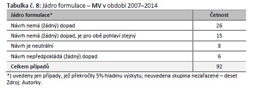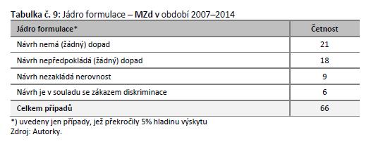 Korektní způsob argumentace opětovně vykazuje zejména MV, a to u informačně bohaté a genderovou problematiku reflektující formulace objevující se v letech 2008–2009, která krom popisu dopadů do rovných příležitostí a postavení mužů a žen, zohledňuje i dopady k dalším kategoriím definovaným konceptem GeM – „…návrh nemá žádné dopady ve vztahu k rovnosti postavení z důvodu rasy nebo etnického původu, sexuální orientace, věku, zdravotního postižení, náboženství či víry, ani z jiných obdobných důvodů“ (pět případů). Ve sledované době ještě metodiky nepožadovaly hodnocení s ohledem na diskriminaci a MV je zároveň jediným ministerstvem, které hodnocení formuluje v této komplexitě. Za zmínku stojí i pozoruhodný způsob argumentace, konkrétně užívání záporu, u tvůrců MZd a MV. Zatímco většina formulací MPSV říká, jaký je návrh, co činí, formulace těchto ministerstev cílí na to, jaký návrh není, co nečiní a čemu se snaží bránit.