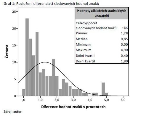 V rámci provedeného šetření bylo zjišťováno celkem 58 proměnných (bez pomocných a konstruovaných znaků) a pro každou z nich byly testovány rozdíly v dosažených hodnotách mezi oběma výběrovými soubory. Z hlediska dalších analýz je třeba uvést, že toto srovnání bylo provedeno na základě dat po obou vlnách dodatečných výzev. Základním výstupem exploratorní analýzy je histogram, který dokumentuje četnost rozdílů v hodnotách sledovaných proměnných mezi oběma výběrovými soubory[14]. Je patrné, že hodnoty všech sledovaných znaků se odchylují od normálního rozložení a jsou sešikmené směrem k nižším diferenčním hodnotám. V průměru se jednotlivé hodnoty znaků mezi oběma soubory liší o 1,28 procentního bodu (střední hodnota přitom činí 0,85 procentního bodu). Nejmenší pozorovaný rozdíl činí 0 procentního bodu (jde tedy o identické hodnoty zjištěné v rámci obou výběrových souborů), zatímco největší diference činí 4,9 procentního bodu. Tři čtvrtiny ze všech 146 porovnávaných hodnot se mezi oběma soubory liší nejvýše o 1,8 procentních bodů.