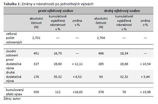 neboť v rámci prvního výběrového souboru zvýšila první vlna dodatečných výzev návratnost o 72 %, zatímco druhá dodatečná výzva přispěla ke zvýšení o 23 %. V druhém výběrovém souboru zvýšila první výzva návratnost o 57 % a druhá výzva pak návratnost zvýšila o dalších 12 %.