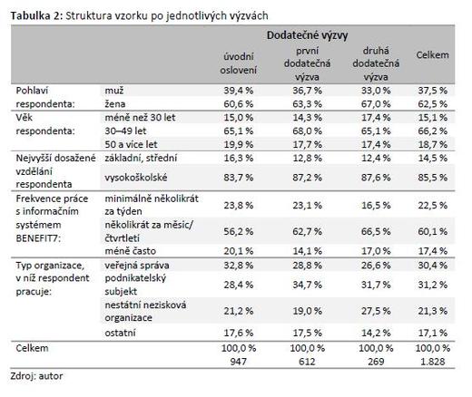 Z výsledků je patrné, že pracovníci z veřejné správy reagovali nejčastěji promptně – tedy bezprostředně na základě úvodní pozvánky k zapojení do výzkumu; naproti tomu zaměstnanci v podnikatelském sektoru reagovali nejčastěji na základě první a druhé dodatečné výzvy. Dále platí, že pracovníci nestátních neziskových organizací reagovali typicky až po druhé dodatečné výzvě. Rovněž jsou zřejmé rozdíly dané frekvencí práce s informačním systémem, kdy promptně odpověděli zejména ti, kteří se systémem BENEFIT7 pracují často (tj. každý den či několikrát týdně), zatímco ostatní reagovali až na první a druhou dodatečnou výzvu. Žádné další změny ve struktuře podsouborů nejsou až na uvedené diference statisticky významné.