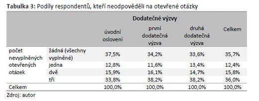 Předmětem srovnání je počet respondentů, kteří neuvedli žádnou odpověď na položené dotazy. V rámci výzkumného instrumentu byly položeny celkem tři samostatné otevřené otázky, v jejichž případě byla on-line aplikace naprogramována tak, že je respondent mohl ponechat bez odpovědi. Počty respondentů, kteří neuvedli žádnou odpověď, jsou patrné z tabulky 3. Platí, že ve skupině respondentů, kteří reagovali bezprostředně na úvodní oslovení, vyplnilo všechny otevřené otázky 37,5 % jednotlivců. Podíl takto pečlivých respondentů ve skupinách respondentů reagujících na dodatečné výzvy klesl o přibližně čtyři procentní body.
