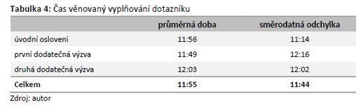 Navíc je na rozdíl od situace u meritorních otázek směrodatná odchylka v rámci dodatečných výzev vyšší ve srovnání se skupinou promptních respondentů (přibližně o jednu minutu), což ukazuje na větší rozptyl dat v případě respondentů zapojujících se až na základě dodatečných výzev.