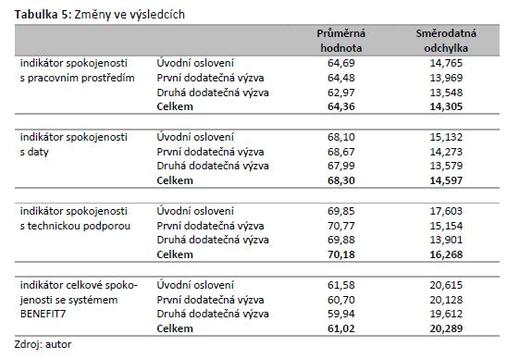Postupné snižování hodnoty je patrné v případě indikátoru spokojenosti s pracovním prostředím, kdy dodatečné výzvy snížily průměrné hodnocení z 64,69 % na celkových 64,36 %, a indikátoru celkové spokojenosti se systémem BENEFIT7, kdy došlo ke snížení z 61,58 % na celkových 61,02 %. Inkonzistentní vliv výzev na výzkumné odhady je patrný v případě indikátorů spokojenosti s technickou podporou a spokojenosti s daty.