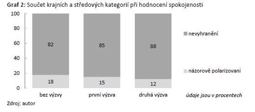 Z podrobnější analýzy se dále ukazuje, že v rámci dodatečných výzev (bez ohledu na to, zdali jde o první či druhou výzvu) je směrodatná odchylka vždy nižší než v případě promptních odpovědí[18]. Na možnou příčinu snižující se směrodatné odchylky poukazuje další z provedených analýz, která dokumentuje postupné zapojování názorově nevyhraněných respondentů. Z dostupných dat lze vysledovat zřetelnou tendenci, kdy názorově polarizovaní respondenti (tj. ti, kteří jsou velmi spokojeni nebo velmi nespokojeni) reagují promptně, zatímco nevyhranění (tedy spíše spokojení nebo spíše nespokojení) se do výzkumu zapojují až na základě dodatečných výzev.