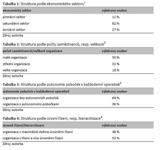 Přestože řada autorů upozorňuje na diferencující účinky velikosti nebo odvětví (Kortekaas, 2007; Garengo a kol., 2005: 30; Kok, 2002: 13; Taylor a Taylor, 2014; Cocca a Alberti, 2010; Sovová, 2014; Vacula a kol., 2008; Bartelová, 2004), bez uvažování organizační struktury by nebyly mezi organizacemi shledány rozdíly. Teprve hierarchizace a méně pak decentralizace zprostředkovaně poukazuje na význam velikosti a sektoru, přičemž se potvrzuje zvláště výlučnost terciární sféry. Je však potřeba vzít v úvahu, že obě v zásadě protikladná organizační řešení sice vyvolávají zvýšený důraz na oblast HRM, ale výběr postupů a indikátorů se může lišit.