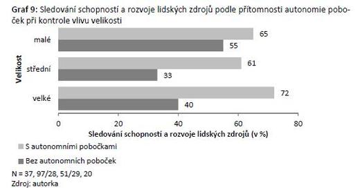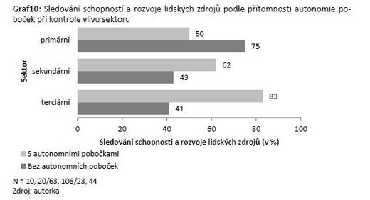V terciárním sektoru (viz Graf 10) sledovalo daný indikátor 41 % organizací bez autonomních poboček a 83 % organizací s pobočkami; v sekundárním sektoru to pak bylo 43 % ku 62 %. S nárůstem volnosti pobočky při rozhodování, s nárůstem velikosti a směrem k terciárnímu sektoru dochází i k posilování významu sledování schopností a rozvoje lidských zdrojů. To odpovídá představě, že decentralizací dochází ke zvýšení tlaku na inovativní procesy poboček, což se může projevovat právě důrazem na sledování schopností lidského kapitálu, zvláště pak pokud jde o terciární sektor.