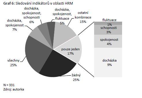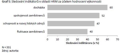 Také české organizace následují obecný trend (Synek, 2008; Deloitte Touche Tohmatsu, 2007) a finanční indikátory pro ně představují hlavní nástroje hodnocení výkonnosti organizace (84 % používá ziskovost). Obecně jsou vybrané HRM indikátory používány především v závislosti na existenci autonomie poboček a vnímání výkonnosti v oblasti HRM jako důležité pro celkový rozvoj organizace. Nejčastěji sledovaným indikátorem je docházka (60 %), která tak zaujímá pozici klíčového indikátoru. V drtivé většině ji ale organizace sledují spolu s dalšími indikátory. Celkem 25 % organizací pak sleduje všechny vybrané indikátory zároveň a je zde otázkou, zda je taková praxe, vzhledem k provázanosti absence, fluktuace a spokojenosti, na níž poukazuje Dwivedi (1995), Hiltrop a Despres (1994), nutná a zda nejde spíše o sběr snadno dostupných dat na úkor těch s vyšší výpovědní hodnotou.