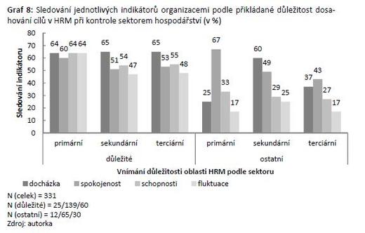 Rozvoj lidských zdrojů představuje nákladovou položku a lze předpokládat, že rozhodnutí týkající se těchto aktivit budou v užším vztahu s vnímáním důležitosti HRM pro rozvoj organizace. Data ukazují (viz Graf 7, Graf 8), že tomu tak není v případě velkých organizací, kde je přitom celkově podíl organizací, které daný indikátor sledují, vyšší, než u ostatních velikostních typů (průměrně o 10 %). Na motivaci ale záleží u malých organizací, kde schopnosti a rozvoj zaměstnanců vyhodnocuje 59 % subjektů, které dosahování cílů v oblasti HRM považují za důležité, zatímco tak činí pouze 29 % ostatních subjektů, v případě středních organizací je poměr 49 % ku 20 %. Co se týče diferenciace napříč sektory, pak v sekundárním to je 54 % organizací, které dosahování cílů v oblasti HRM považují za důležité a 29 % ostatních. V případě terciárního sektoru činí poměr 55 % ku 27 %. V zásadě se tak potvrzuje předpoklad o spojitosti rozvoje kvalifikace a vnímání dosahování cílů v oblasti HRM jako důležitých pro dlouhodobý rozvoj organizace.