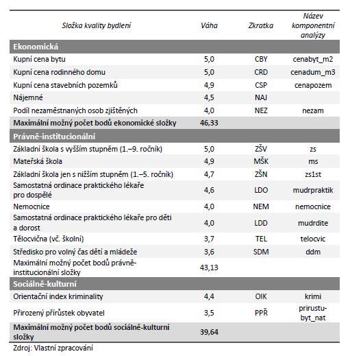 Výsledné hodnocení všech ukazatelů zobrazuje Příloha 1, kde jsou vypočteny prosté aritmetické a alfa-useknuté průměry a rozptyly odpovědí. Lze předpokládat, že ukazatele s nejvyššími bodovými známkami a nejnižšími rozptyly mají nejvyšší vliv na kvalitu bydlení. Ukazatelů s vyšším průměrem než 4,5 bodu a nižším rozptylem než 0,5 bylo sedm (cena bytu, přítomnost základní školy, přítomnost MHD, kupní cena stavebních pozemků, přítomnost mateřské školy a výše nájemného). Druhé nejvyšší skóre obdrželo 12 ukazatelů s vyšší bodovou známkou než 3,7 nebo s vyšší známkou než 4,5 a rozptylem do 2 bodů (viz Tabulka 1). Hodnoty alfa-useknutých průměrů vybraných ukazatelů byly dále použity jako váhy ukazatelů při konstrukci indexů složek kvality bydlení a přeneseně i v konstrukci celkových indexů kvality bydlení.