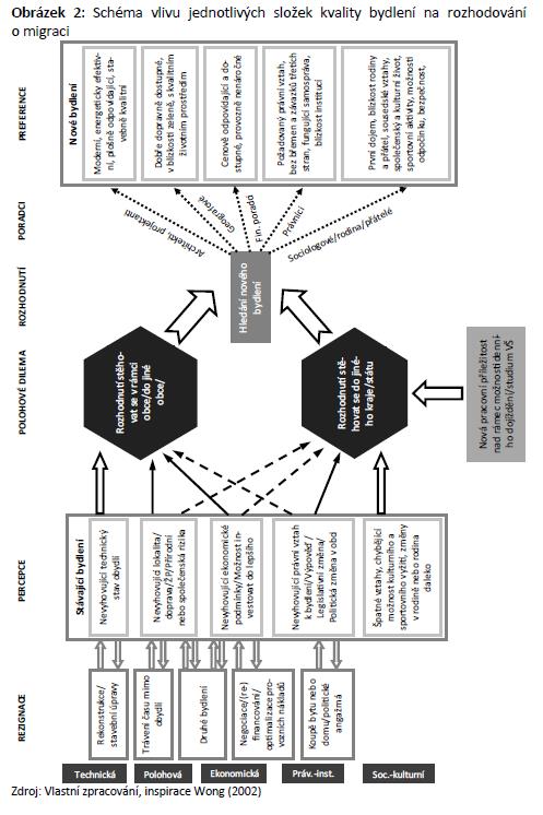Část informací o rozhodovacím procesu lze získat ze studií behaviorální ekonomie založené na konceptu racionality (snahy obyvatel o maximalizaci užitku) při změně místa bydlení. Wong (2002) zpracoval koncepční model rozhodování domácností o stěhování, který je výstupem stávajících podmínek bydlení. Reakcí na negativní percepci podmínek místa může být buď určitá změna podmínek bydlení (z pohledu stěhování rezignace) nebo stěhování se do jiného obydlí na jiném místě. Rozdíl mezi změnou bydlení a stěhováním přichází při překročení určité hranice stresu domácnosti ovlivněné mimo jiné náklady na stěhování a výší dalších transakčních nákladů (Edin, Englund 1991). Rozhodnutí o stěhování do jiného kraje (případně státu) může být důsledkem percepce odlišných aspektů, resp. složek kvality bydlení než rozhodnutí se stěhovat do jiné obce (případně mikroregionu). Při tomto polohovém dilematu lze očekávat, že důvodem k vystěhování se z kraje bude nespokojenost se sociálně-kulturní složkou kvality bydlení, nikoliv však technická složka kvality bydlení (viz Obrázek 2).