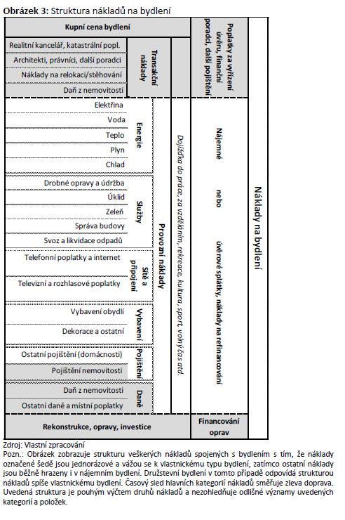 Podstatnou součástí ekonomické složky kvality bydlení je výše nákladů na provoz bydlení. Náklady na bydlení buď jednorázově nebo pravidelně snižují disponibilní příjmy domácností a tvoří jejich hlavní součást (viz Obrázek 3).