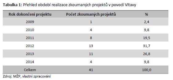 Pro oblast snížení znečištění vod tak disponujeme informacemi o 1121 projektech za celou Českou republiku, z nichž jsme vybrali projekty realizované v povodí Vltavy (doba jejich realizace je uvedena v tabulce č. 1). Zároveň také disponujeme informacemi o všech obcích v ČR z databáze CEDR III a ČSÚ. Databáze CEDR III obsahuje informace o dotacích vyplácených skrze státní rozpočet České republiky a zahrnuje i informace o investicích do ČOV, které předcházely OP ŽP, či byly financovány souběžně s OP ŽP, ale z jiných zdrojů. Průměrná částka v oblasti zlepšování vodohospodářské infrastruktury a snižování rizika povodní – Oblast podpory 1.1 – Snížení znečištění vod činí na projekt 60 mil. Kč.