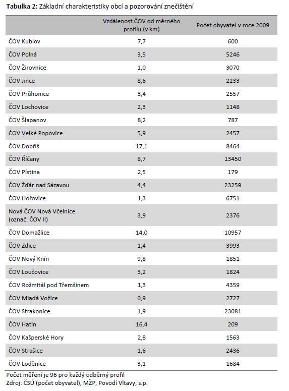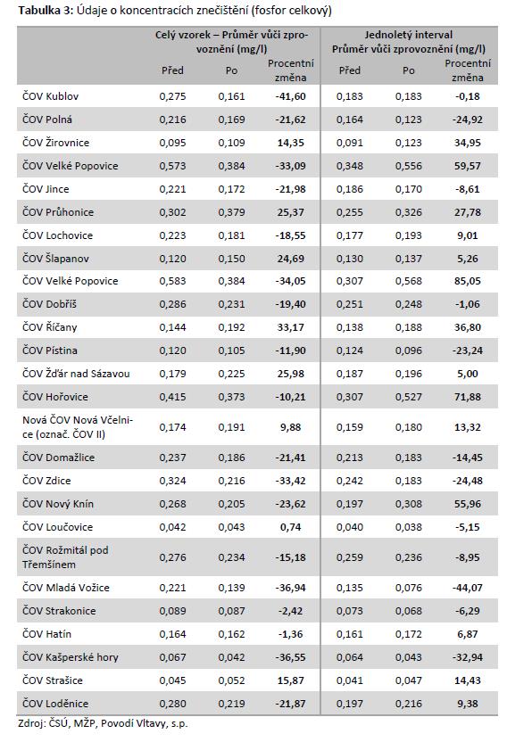 Povodí Vltavy, s.p. poskytlo data o kvalitě povrchových vod, ve kterých bylo identifikováno, kdy a na jakém odběrném profilu byla hodnota změřena. Čistota vody byla měřena pomocí koncentrací znečišťujících látek celkový fosfor (mg/l) a fosforečnany (mg/l). Data zahrnují měsíční měření na nejbližším odběrném profilu po proudu pod výpustí ČOV období od ledna 2007 do prosince 2014.