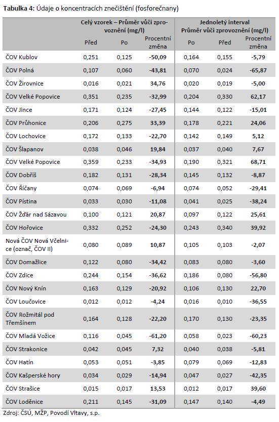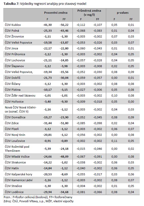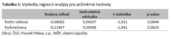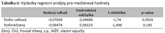 Koncentrace fosforu celkového tedy v průměru klesly o 8 %, kdežto koncentrace fosforečnanů klesly o 11,5 %. Výše uvedené hodnoty jsou statisticky signifikantní na 10% hladině. Pokud bychom použili standardně uvažovanou hladinu 5 %, pak bychom museli od tohoto závěru ustoupit. Pokud bychom uvažovali i dodatečné regresní proměnné zmíněné výše, pak se bodové odhady parametru β nezmění.