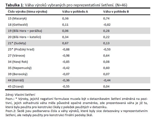 [1] Řídící otázka, která uváděla hodnocení celé baterie výroků, pak zněla: „Nyní Vám přečtu 12 výroků o postavách, událostech, svátcích a místech spjatých s českými dějinami. U každého mi prosím řekněte, jak moc vyjadřuje Vaše přesvědčení, nebo jak moc Vašemu přesvědčení odporuje. Pokud se s výrokem maximálně ztotožňujete, dejte mu +4 body, pokud se s ním ztotožňujete, ale slaběji, dejte mu méně kladných bodů. Pokud výrok Vašemu přesvědčení maximálně odporuje, dejte mu -4 body. Pokud Vašemu přesvědčení odporuje, ale slaběji, dejte mu méně záporných bodů. Pokud ve Vás výrok nic nevyvolává, dejte mu 0 bodů.”