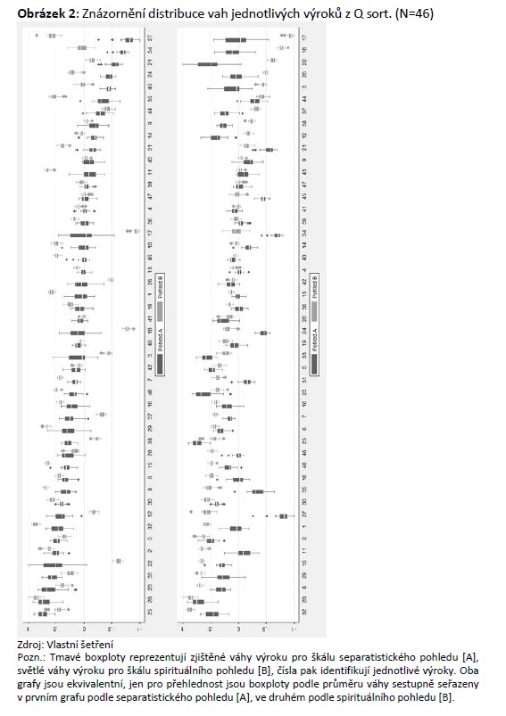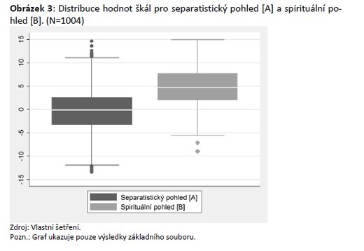 Díky analýze dat z Q sort máme k dispozici váhy, díky kterým jsme mohli zkonstruovat pro každý ze dvou výše uvedených pohledů Likertovu škálu. Jako nejlepší řešení se ukázaly Likertovy škály, které byly založené na 9 výrocích prezentujících náboženský pohled. Tedy, vynásobili jsme váhou stupeň ne/souhlasu s výrokem a výsledky sečetli, pro každého respondenta z reprezentativního souboru tak máme dva číselné údaje. První nám říká, jak moc je respondentovi blízký separatistický pohled [A], a druhý, jak moc je mu blízký spirituální pohled [B]. Výsledek vidíme na Obrázku č. 3.