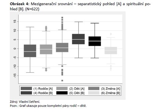 Relativní podstatu Q metody (a také nástrojů konstruovaných s její pomocí) je třeba brát v potaz při plánování výzkumu. První možností je aplikovat tento přístup na problém, který je svou povahou relativní (srovnání různých podskupin, srovnání populačního ukazatele před a po zamýšlené intervenci atd.). Tento přístup můžeme ilustrovat na Obrázku č. 4, kde lze sledovat generační vývoj kolektivní náboženské paměti, srovnáváme tedy skupinu rodičů se skupinou jejich dětí. V levé části Obrázku č. 4 vidíme, že pohled [A] velmi mírně posiluje (první a druhý boxplot). Změna je však velmi volatilní (třetí boxplot) – některé děti se ve srovnání s rodiči k tomuto pohledu velmi silně přiklonili, jiné se od něj zase velmi silně odklonili. Byť je tedy čistá mezigenerační změna velmi mírná (nárůst o 0,70 bodu), hrubá změna na úrovni jednotlivých párů je masivní (průměrný posun na jeden pár je 3,35 bodu). Pohled [B] naopak oslabuje (čtvrtý a pátý boxplot), dokonce je toto oslabení (1,03 bodu) o něco větší než posílení separatistického pohledu [A]. Změna je ale méně volatilní (třetí a šestý boxplot) – z grafu je vidět, že v případě změn u spirituálního pohledu [B] je rozpětí extrémních změn menší, také rozpětí mezi prvním a třetím kvartilem je menší (pohled [A] 5,0 bodu, pohled [B] 3,9 bodu). Můžeme tedy říci, že čistá změna vývoje české náboženské kolektivní paměti je mírná, doprovází ji však výrazná hrubá změna. Mírně posiluje separatistický pohled [A], u kterého je i mírnější čistá změna, a oslabuje spirituální pohled [B], u kterého je i slabší hrubá změna.